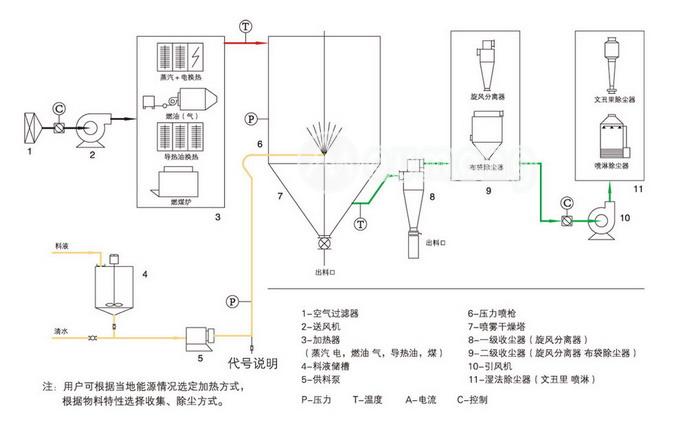 壓力式噴霧造粒干燥機主要由供料系統(tǒng)、干燥系統(tǒng)、除塵系統(tǒng)、加熱系統(tǒng)和電器系統(tǒng)組成,而每一系統(tǒng)又包括一些相關設備。