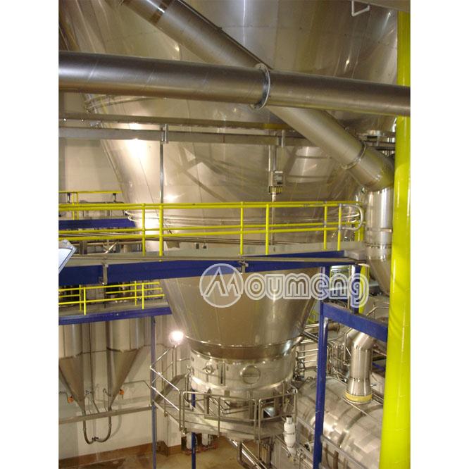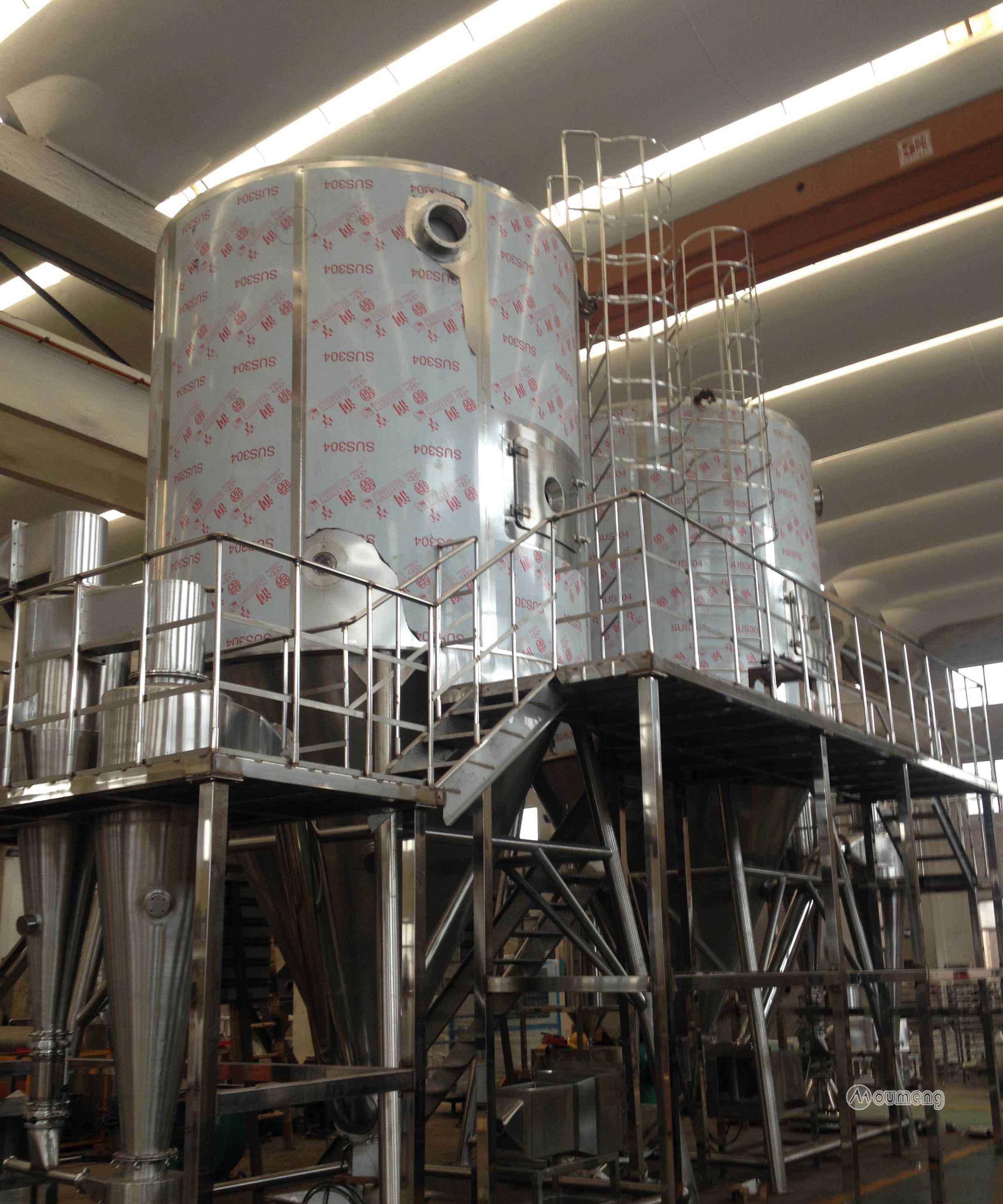 工作原理空氣經(jīng)過(guò)濾和加熱,進(jìn)入干燥器頂部空氣分配器,熱空氣呈螺旋狀均勻地進(jìn)入干燥室。料液經(jīng)塔體頂部的高速離心霧化器,(旋轉(zhuǎn))噴霧成極細(xì)微的霧狀液珠,與熱空氣并流接觸在極短的時(shí)間內(nèi)可干燥為成品。成品連續(xù)地由干燥塔底部和旋風(fēng)分離器中輸出,廢氣由風(fēng)機(jī)空。