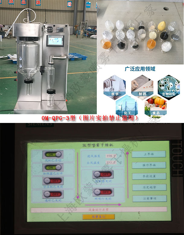 實(shí)驗(yàn)室小型噴霧干燥機(jī)適用于高校、研究所和食品醫(yī)藥化工企業(yè)實(shí)驗(yàn)室生產(chǎn)微量顆粒粉末,對(duì)所有溶液如乳濁液、懸浮液具有適用性, 適用于對(duì)熱敏感性物的干燥如生物制品、生物農(nóng)藥、酶制劑等。因?yàn)樗鶉姵龅奈锪现皇窃趪姵伸F狀時(shí)才受到高溫且是瞬間受熱,故這些活性材料在干燥后仍維持其活性成份不變。